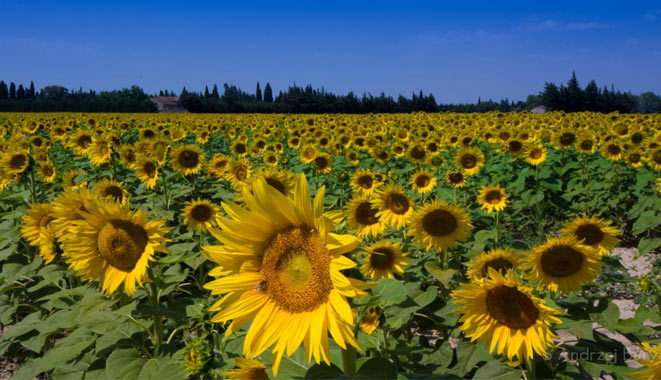 虽然向日葵没有玫瑰那么浪漫,没有百合的纯净,但它温暖、明亮,有着属于自己的独特魅力,而且,它绽放是对梦想、对生活的热爱。当年梵高最喜欢的花就是向日葵。他曾多次描绘向日葵的主题,也爱用向日葵来布置他在阿尔勒的房间。在梵高笔下,向日葵的颜色即代表太阳的颜色,阳光又象征爱情,因此向日葵对于梵高来说具有非常特殊意义。南法的向日葵花田得益于当地得天独厚的条件和气氛,显得更加明媚而灿烂.密密麻麻的向日葵像卫士一样昂首挺胸,迎着炎炎烈日,吐露着迷人的太阳的芬芳. 金黄色的花瓣迎着烈日张牙舞爪地纠结缠绕,释放着一切它从太阳那里吸取的能量,如火焰般给人感觉完美又震撼。